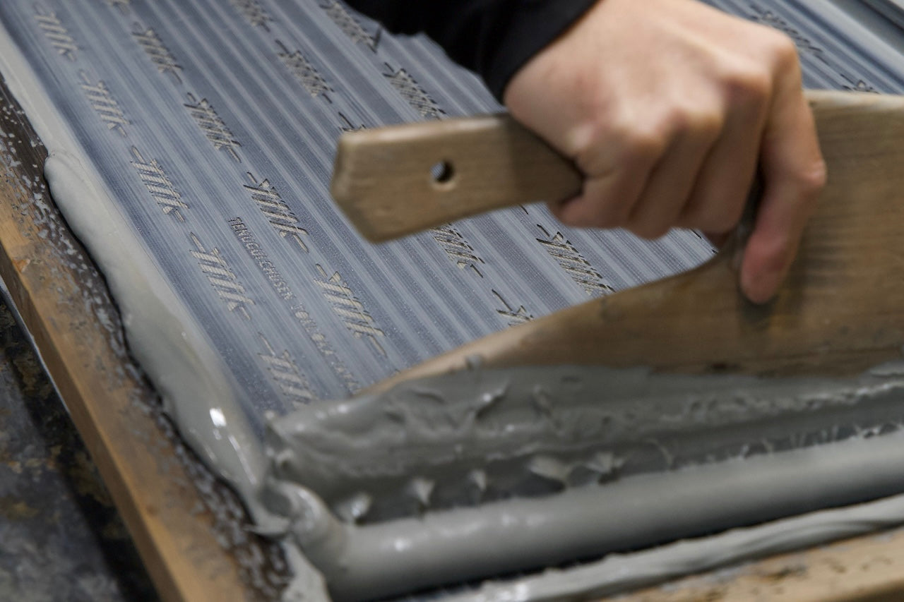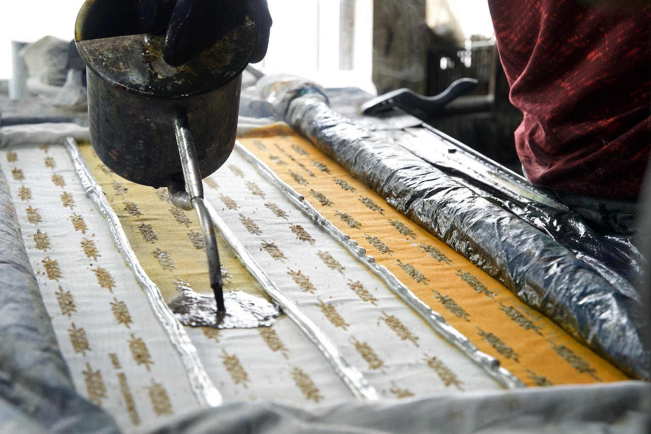 About Chusen This is a dyeing technique that was created in Osaka around 1887. It is a type of paste-applied dyeing method in which a stencil is used to apply a dye-resistant paste. The dye-resistant paste is applied to each stencil on the Japanese-bleached fabric, and the fabric is folded over and the dye is poured in all at once, so the fabric is dyed evenly on both sides. The top fabric is divided into banks called dams into which the dye is poured, so the boundaries become ambiguous as the dye runs through to the bottom, creating a soft impression. It is more suitable for mass production than the classical method, but since there are many steps that require the artisan's sense, it is difficult to mechanize, and the method is still passed down by hand to this day.