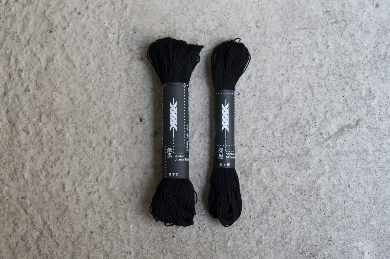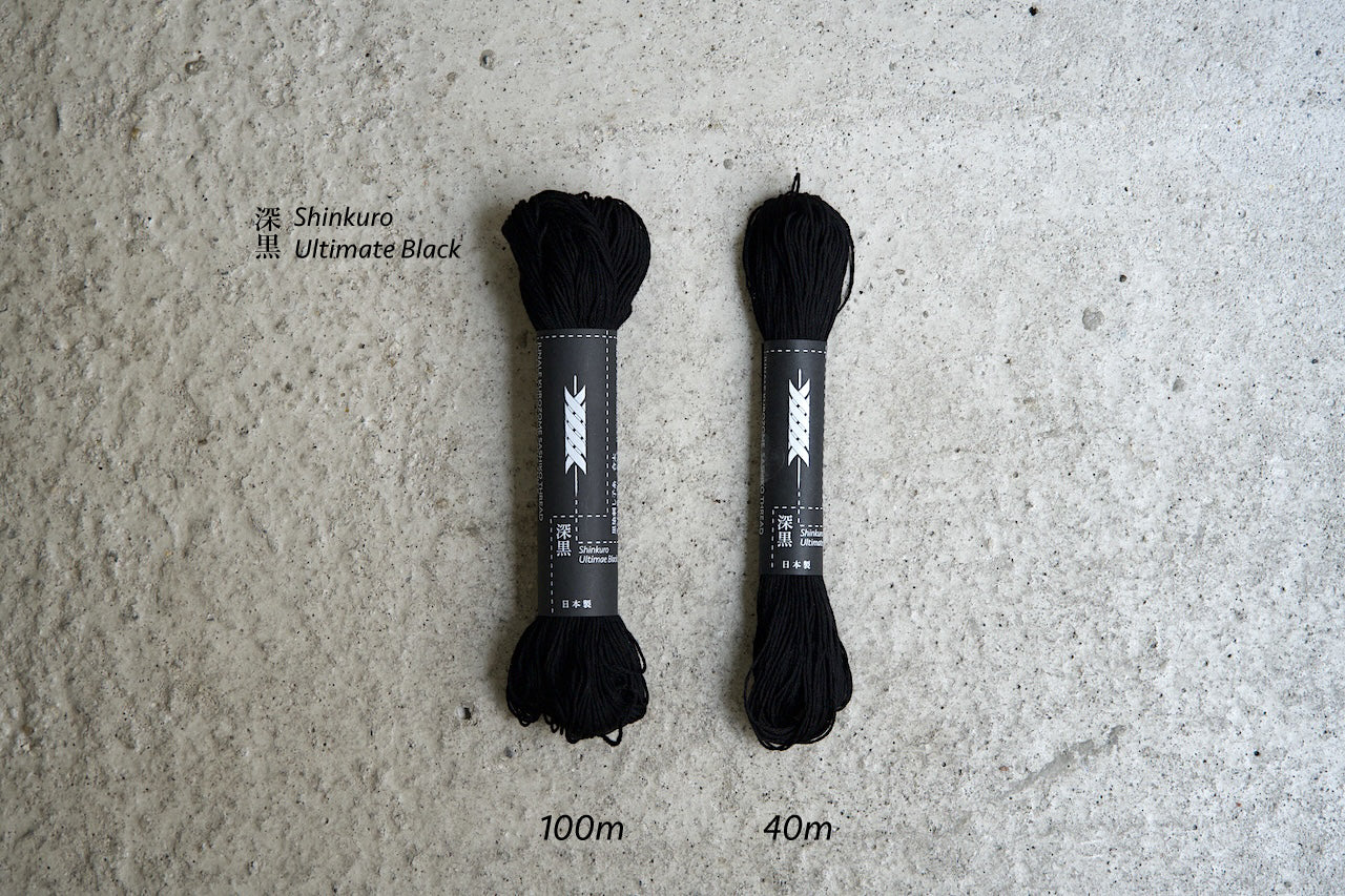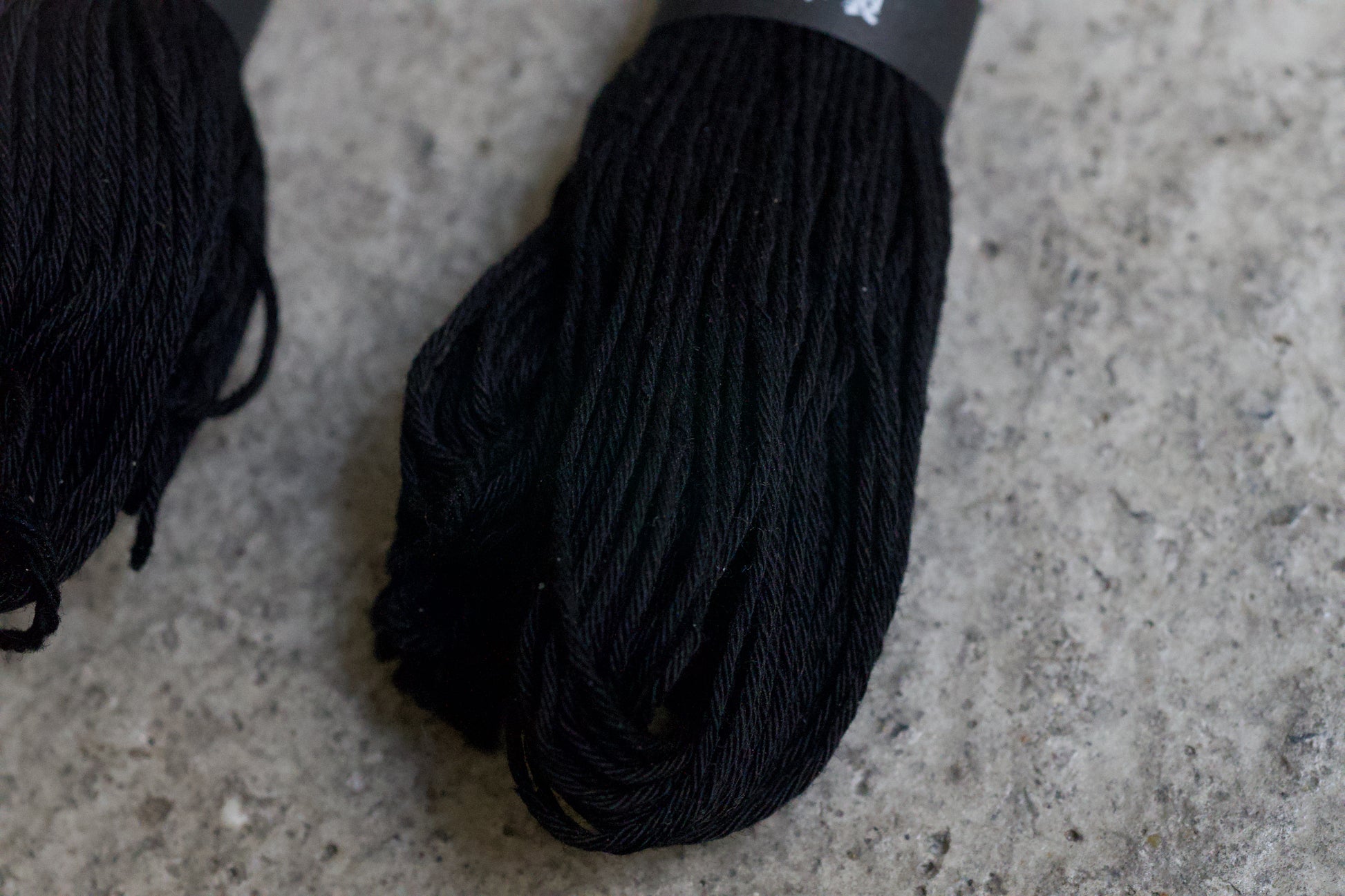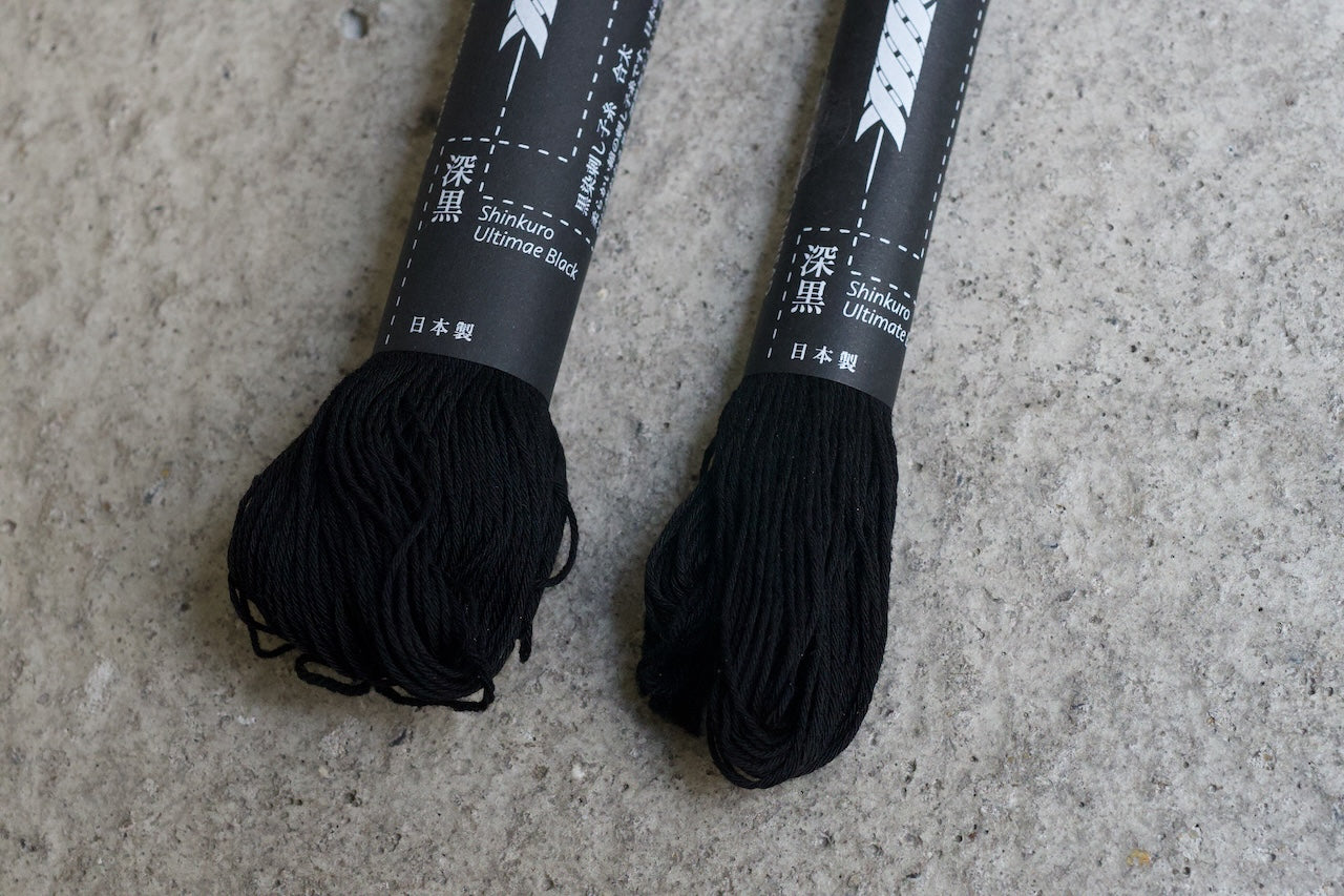 This is a soft cotton sashiko thread. The black color is used in the traditional Japanese formal wear, black montsuki. The unique dyeing technique of "Kyoto Montsuki" called "deep black processing" makes it even blacker than usual, achieving the ultimate black color. After the black dyeing process, it is further processed with deep black processing and dried in the sun to make the black color stand out even more.