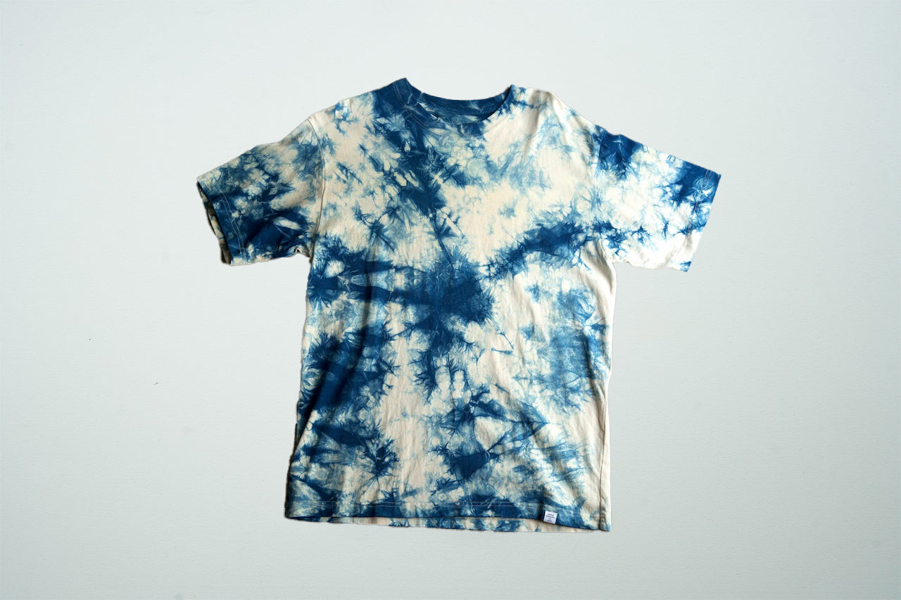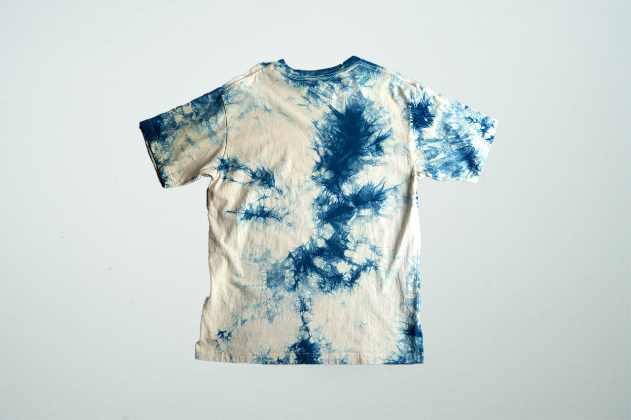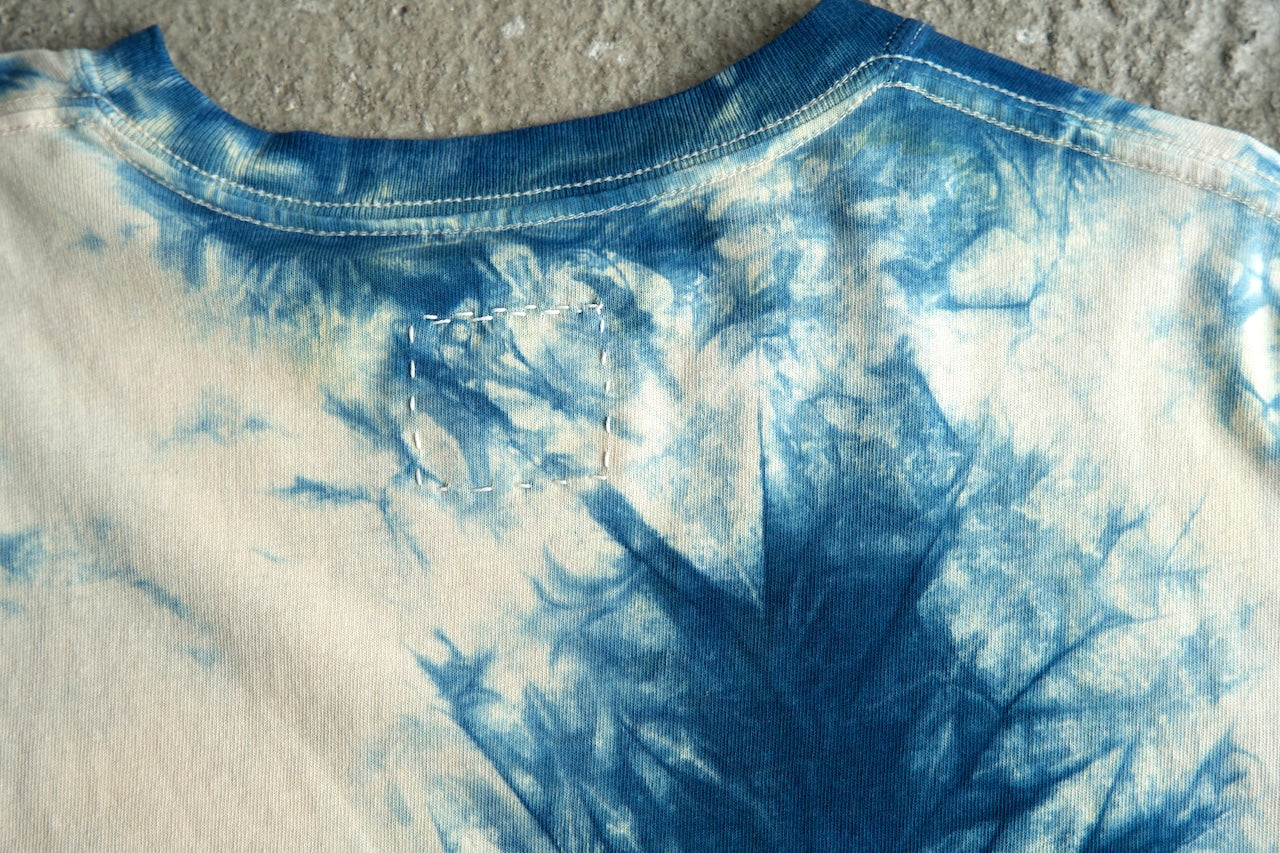 Crafted from open-end yarn, the fabric has a coarse, textured feel. We layered natural sukumo indigo dye over a pigment-dyed base, giving it a deep, organic tone. The chest features a tie-dyed line pattern, adding a unique accent.