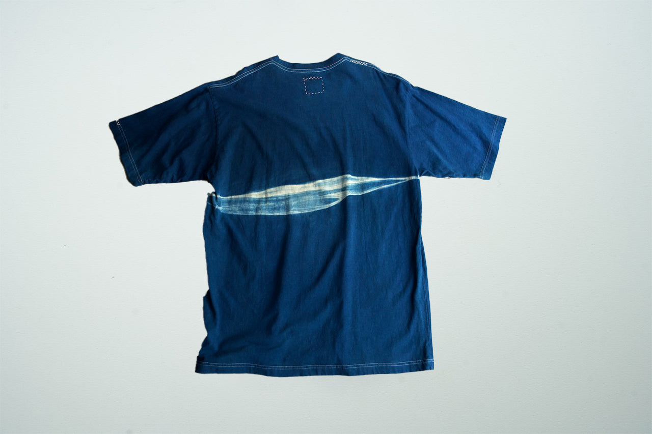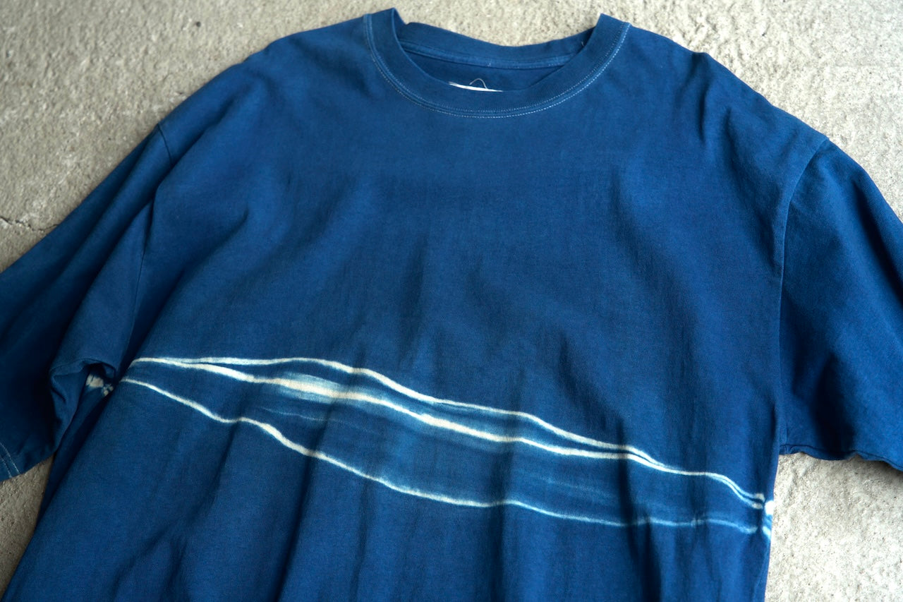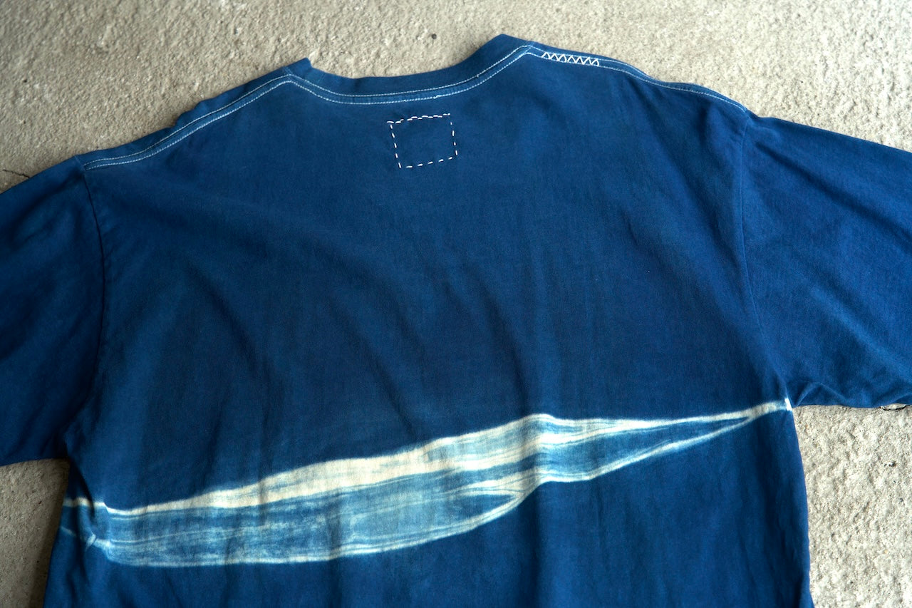 Crafted from open-end yarn, the fabric has a coarse, textured feel. We layered natural sukumo indigo dye over a pigment-dyed base, giving it a deep, organic tone. The chest features a tie-dyed line pattern, adding a unique accent.