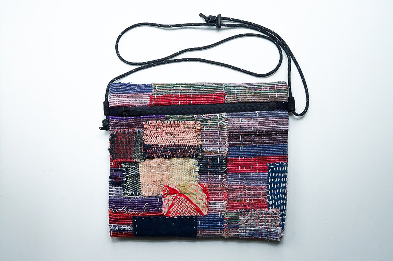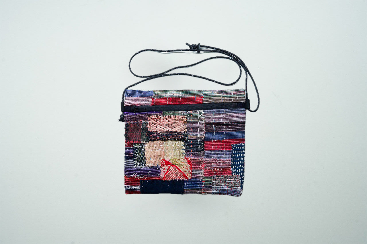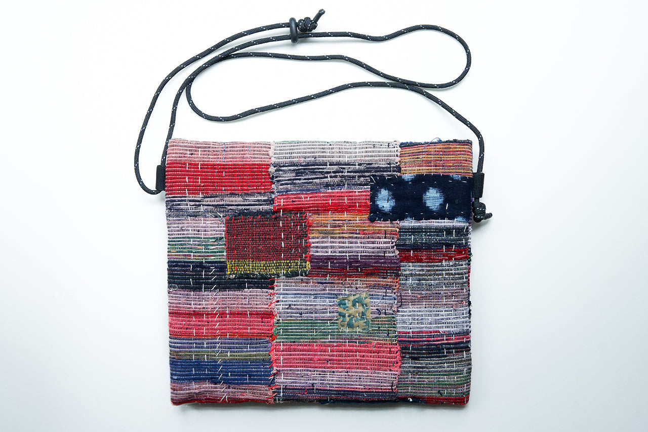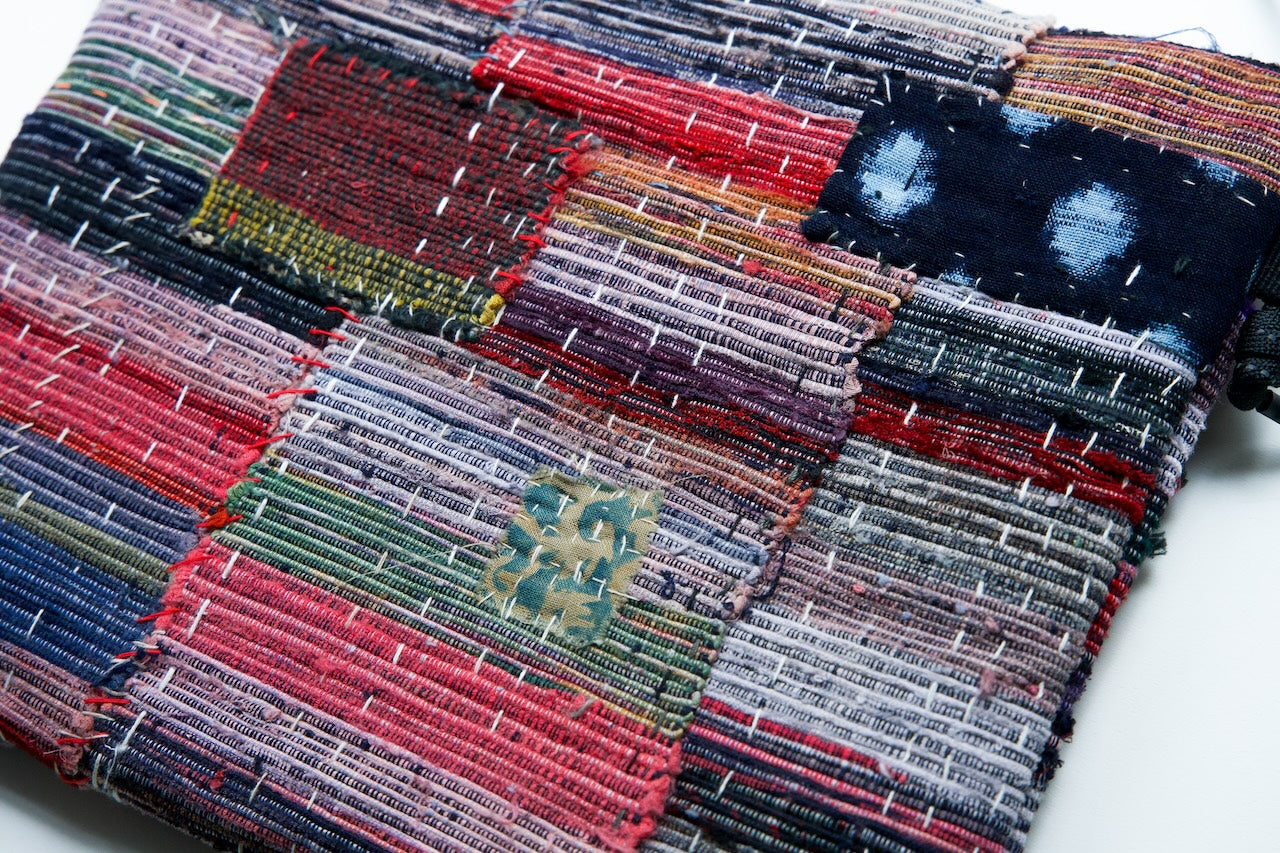 Sakiori is a fabric that is made by tearing used fabric into thin pieces, inserting them as weft threads, and re-weaving them. Many of the sakiori that were actually used had damaged warp threads, so they were reinforced by hand stitching from above in places.
