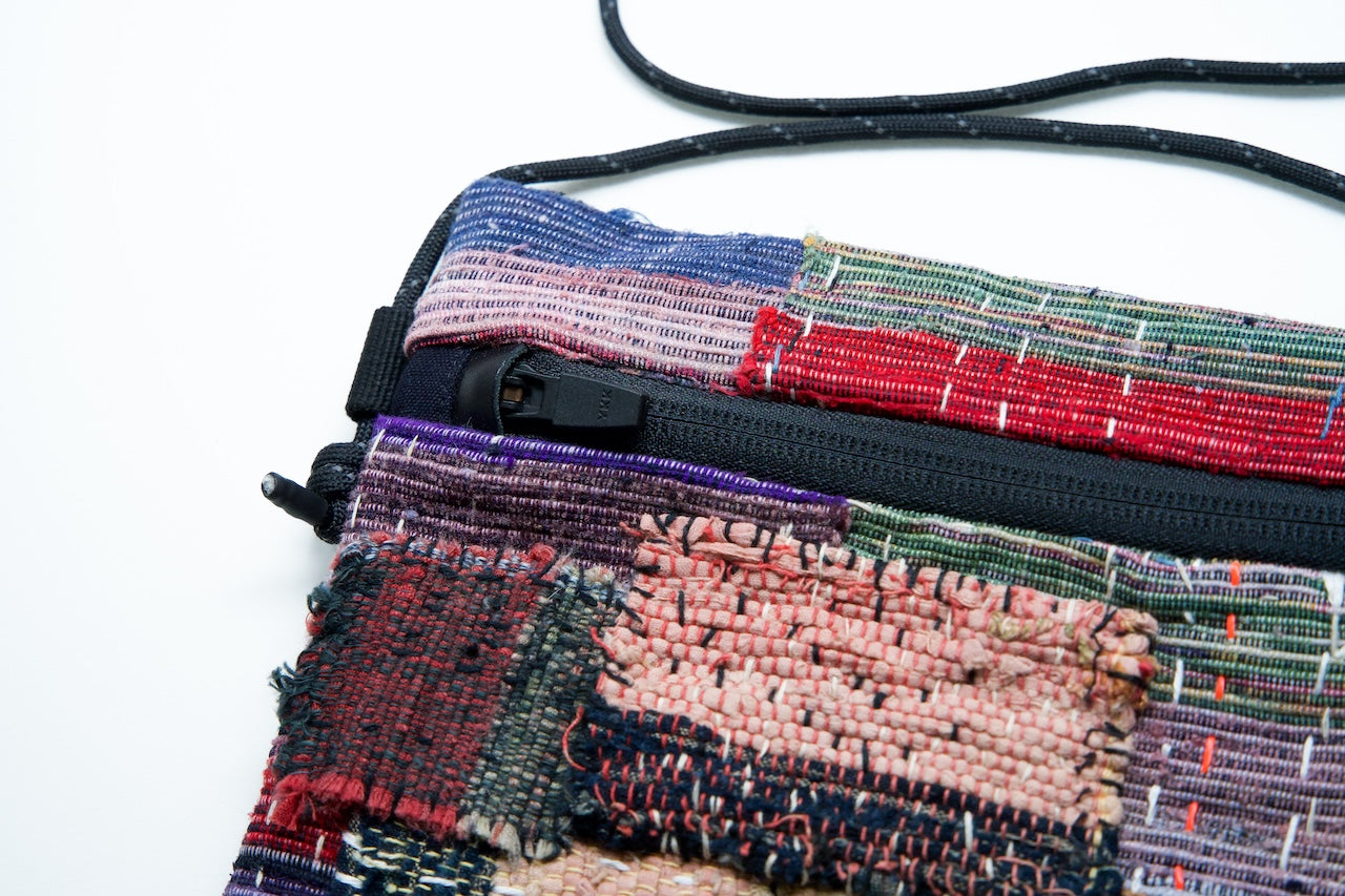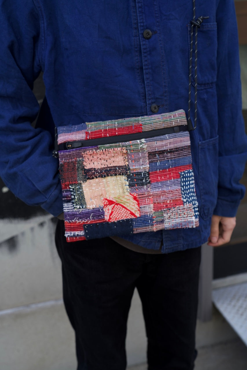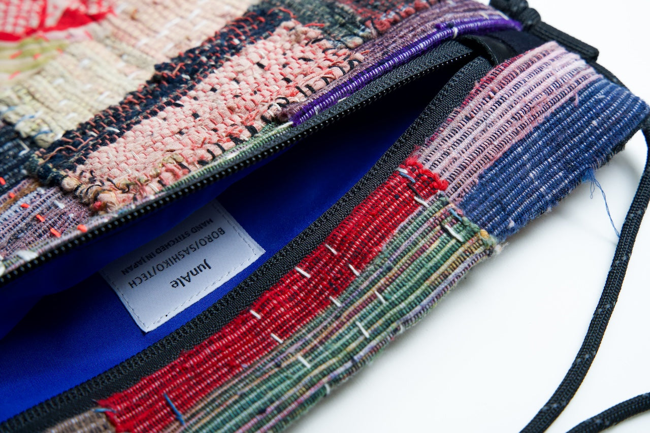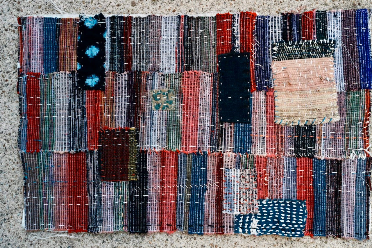 Sakiori is a fabric that is made by tearing used fabric into thin pieces, inserting them as weft threads, and re-weaving them. Many of the sakiori that were actually used had damaged warp threads, so they were reinforced by hand stitching from above in places.