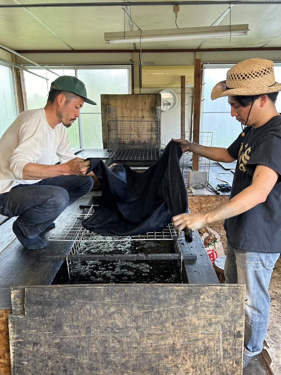 Sashiko weave is a thick fabric made by using thicker yarns for the warp to increase strength. Historically, this material was used in hikeshi hanten (firefighter jackets). The patterns include wale, asanoha (hemp leaf), and ichimatsu (checkered), and they are dyed in three shades of indigo using natural sukumo dye at Aiya Terroir in Fukuyama, Hiroshima Prefecture.
