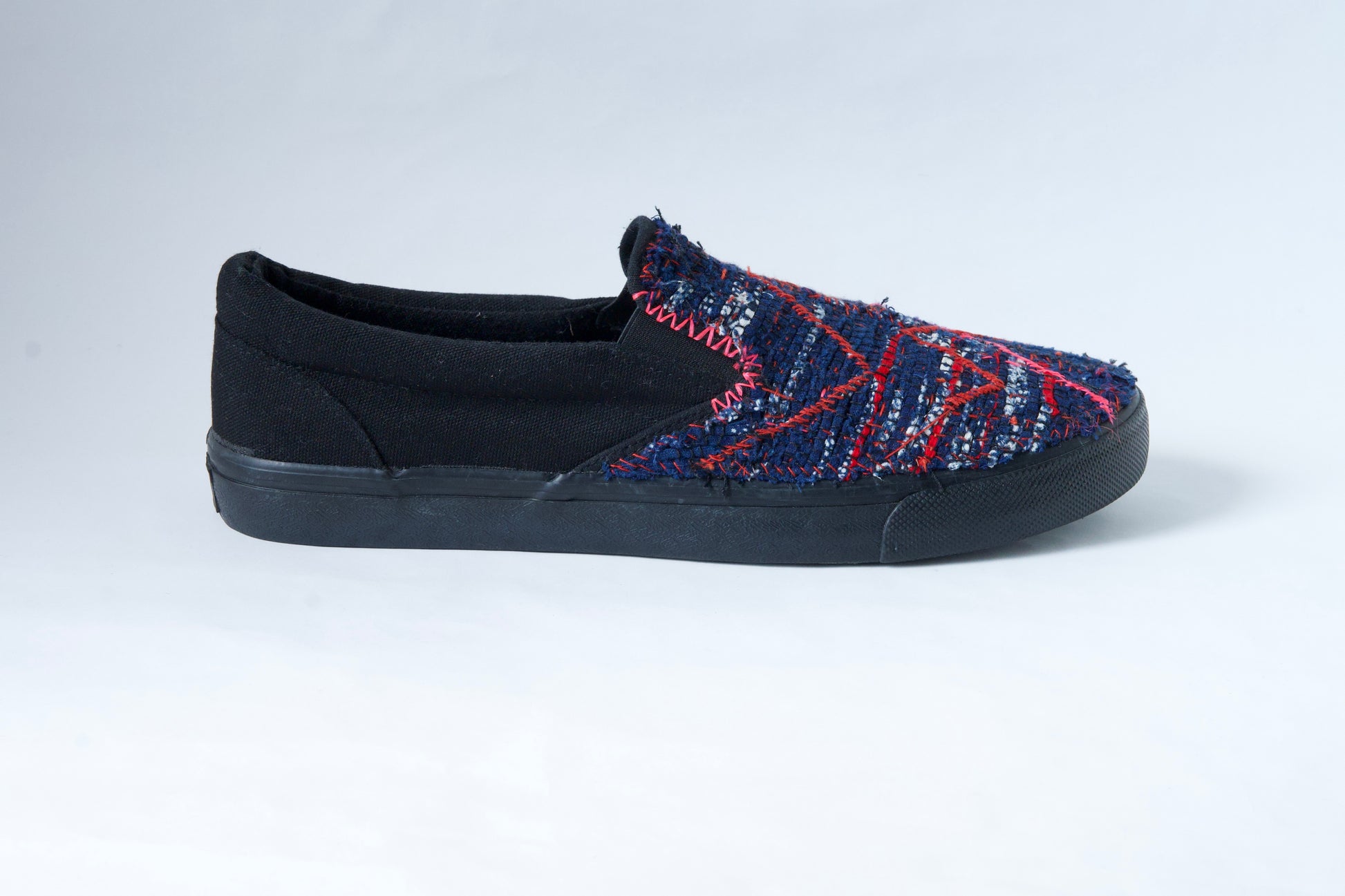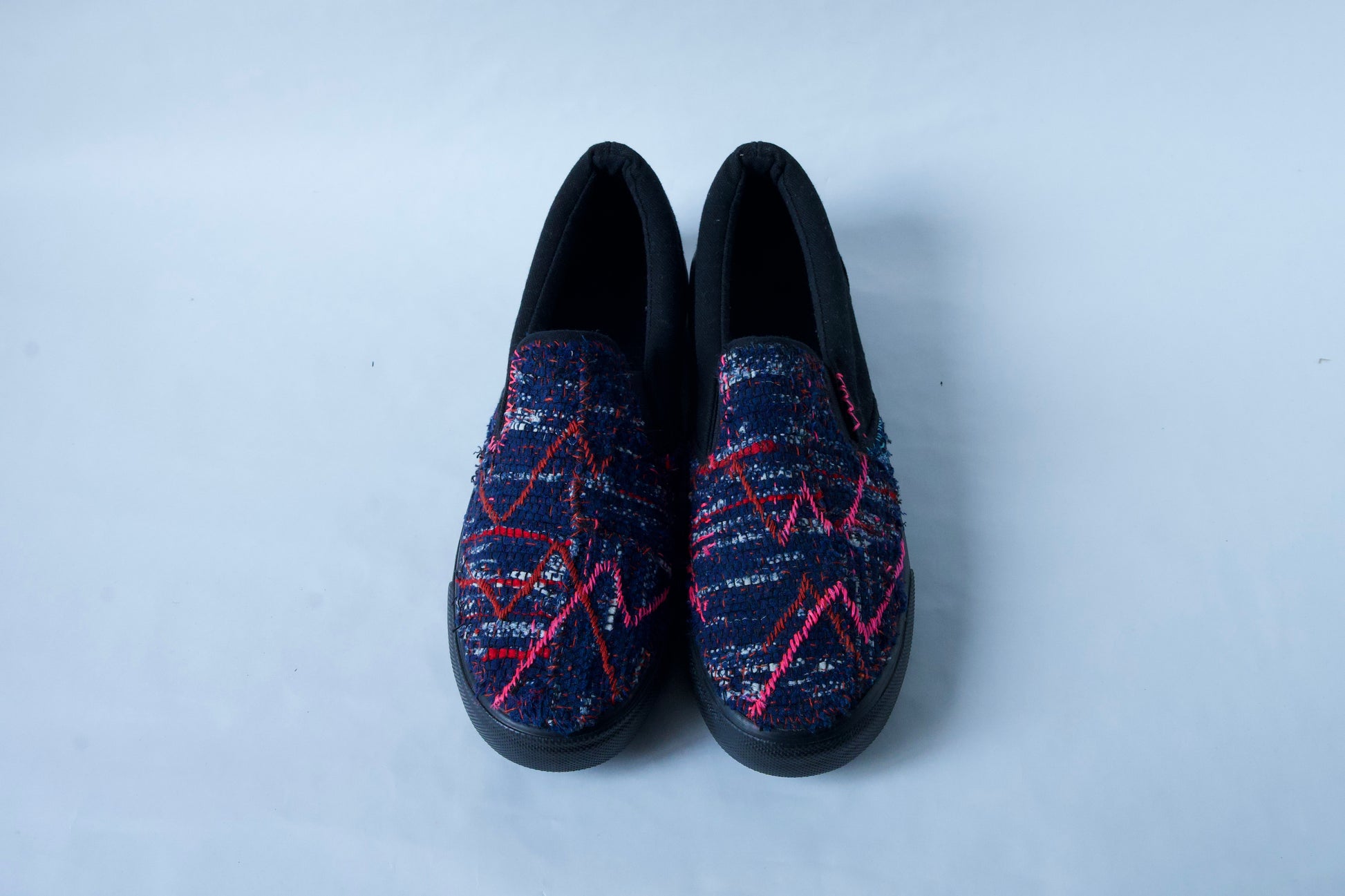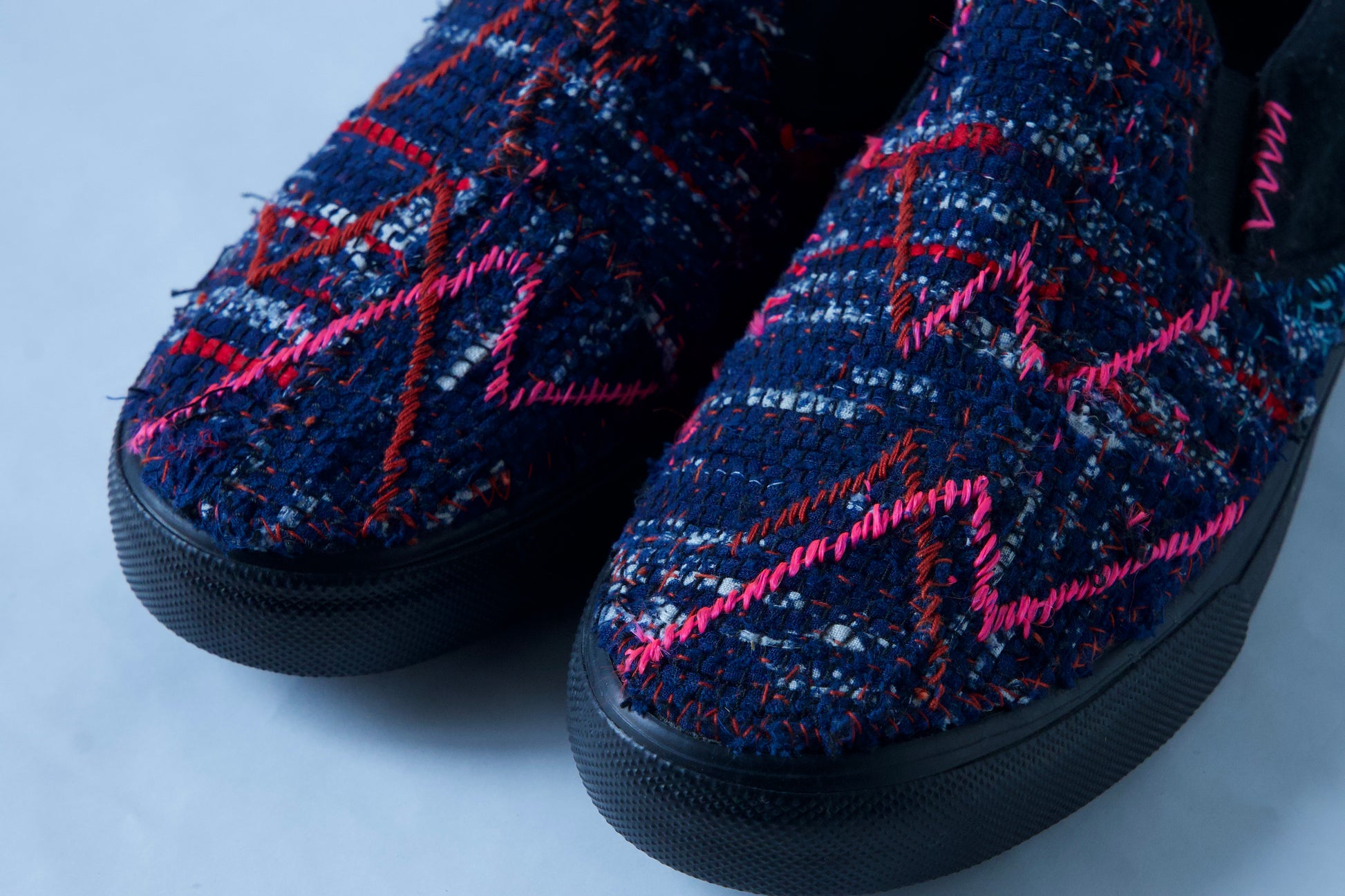 スリッポンシューズに刺し子を施したSASHIKOSNEAKER、日本の古布”襤褸”、JunAleで染色した藍染の糸を使用しています。