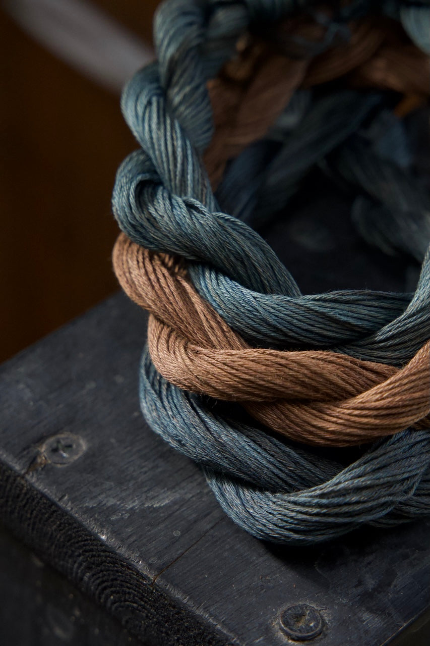 100%綿素材の糸は、刺し子や手縫い、リペアや装飾的な刺繍にも最適。藍染めや生成りの布との相性も良く、落ち着いた渋みのある色合いが仕上がりに豊かな表情を加えてくれます。