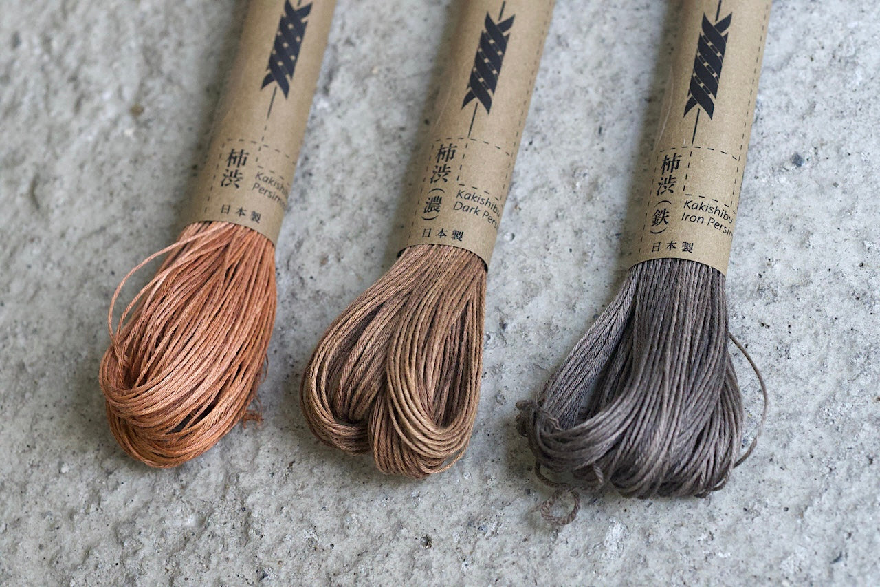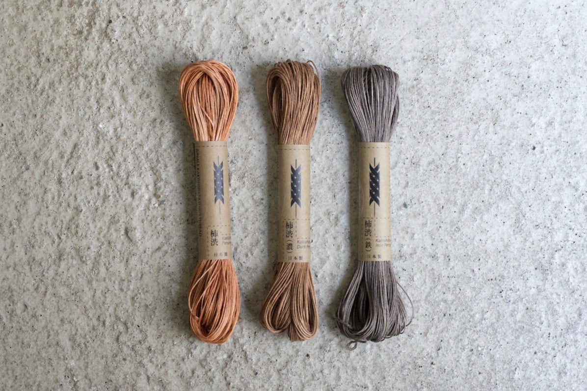 日本の伝統的な染料「柿渋」を用いて染め上げた刺し子糸です。柿渋は発酵させた渋柿から作られる天然染料で、防虫・抗菌性、耐水性を持ち、日本では古くから家具や食器、建具など衣類以外にも使用されてきました。