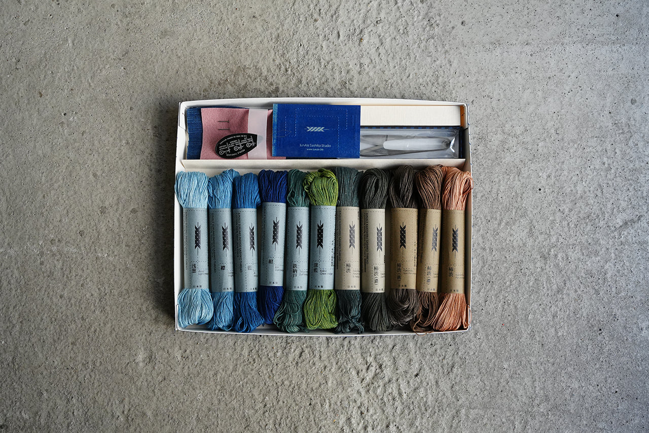 一つ一つ手作業により染色した刺し子糸に加え、刺し子針、糸切り鋏、糸通し、ハギレを詰め合わせた贅沢なセット。