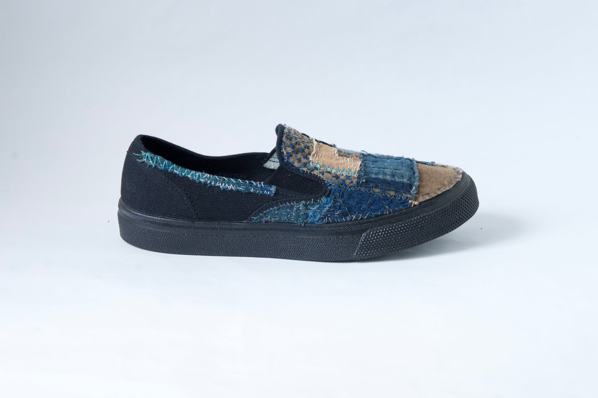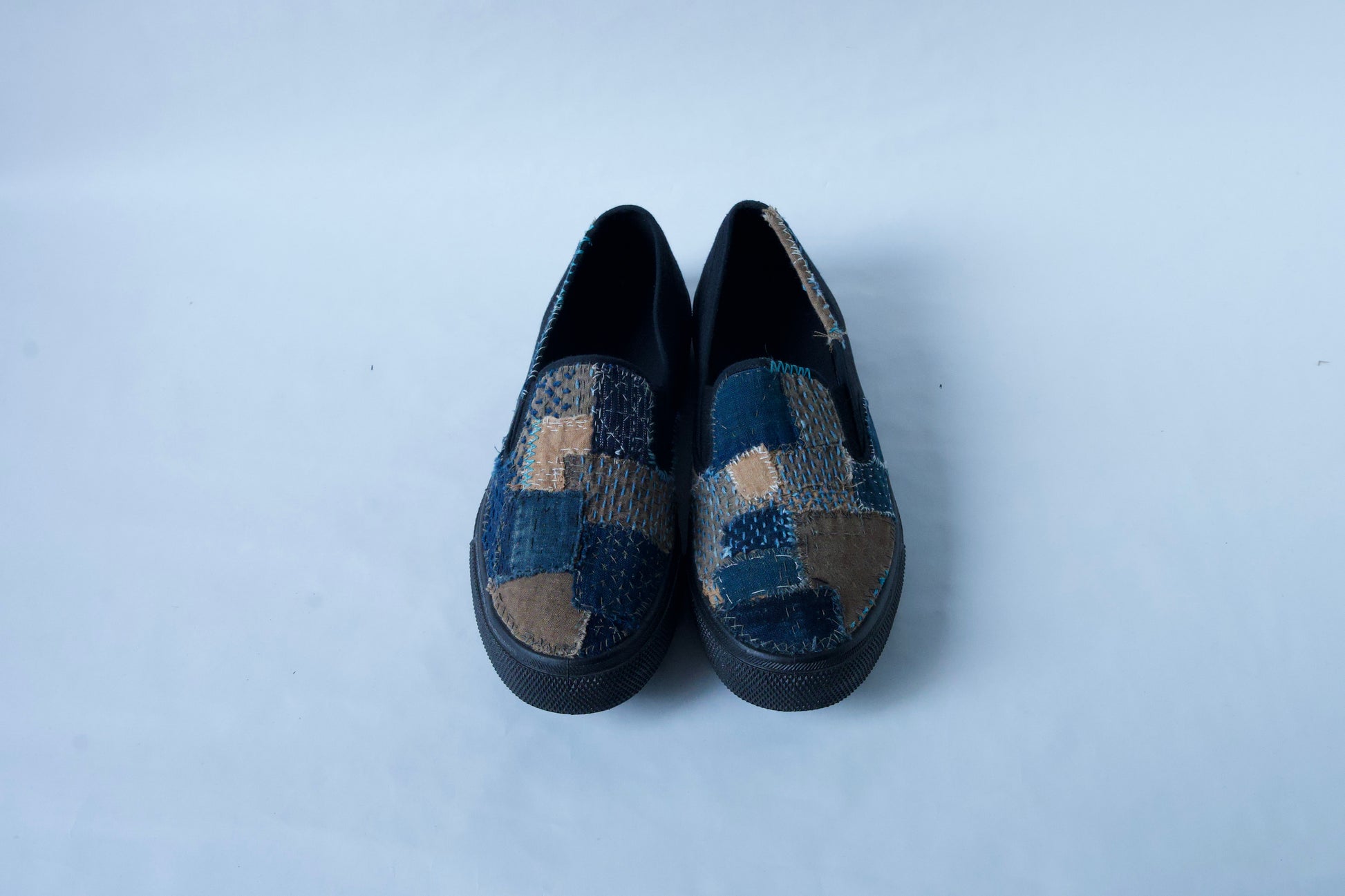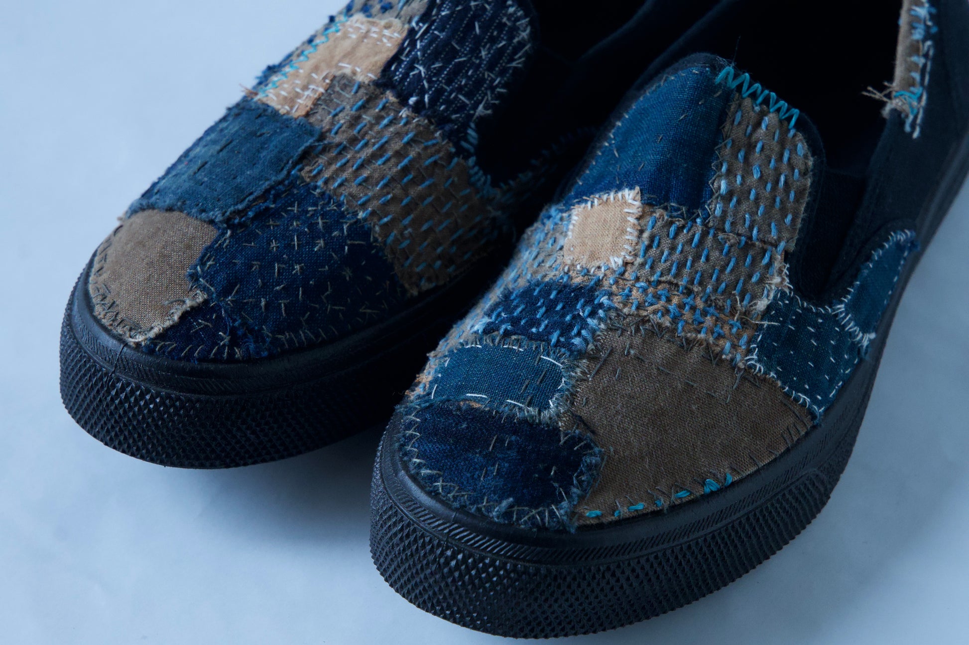 スリッポンシューズに刺し子を施したSASHIKOSNEAKER、日本の古布”襤褸”、JunAleで染色した藍染の糸を使用しています。
