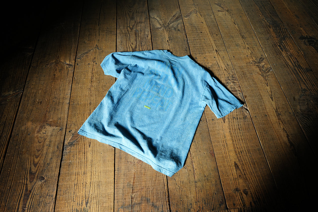 背中にBOROの概念を表したグラフィックを配置し、立体プリントを施した半袖Tシャツに天然染料である蒅を使用して藍で染めた一枚。