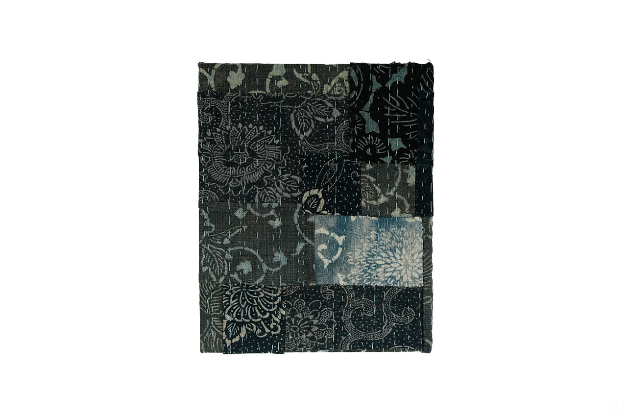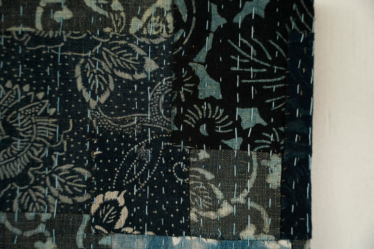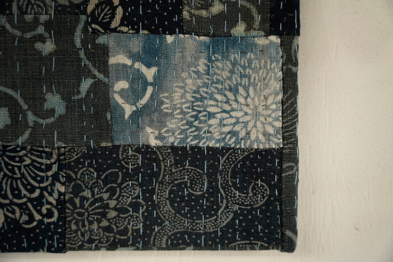 継ぎ接ぎされた布と刺し子のリズムが生み出す奥行きは、古布ならではの存在感を持つアートピース。壁掛けとして空間のアクセントにもおすすめです。